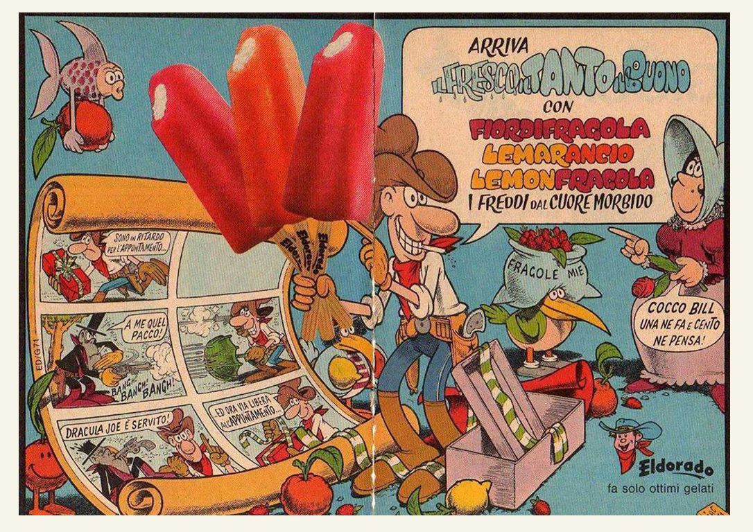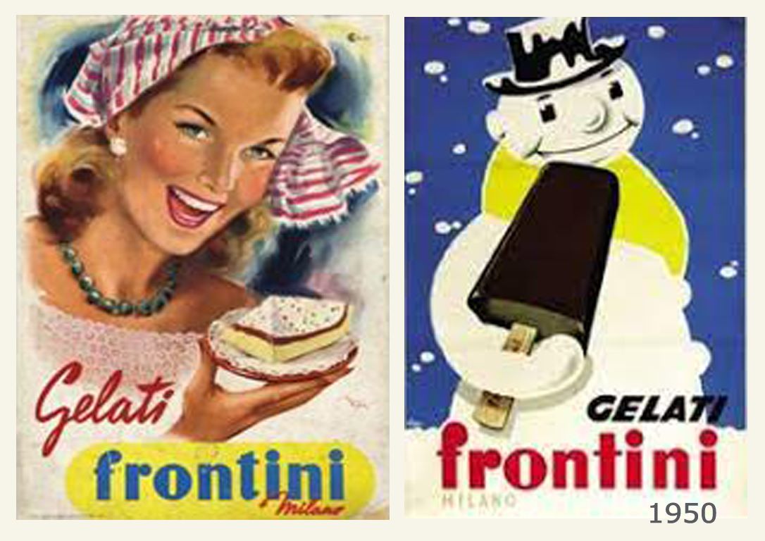 Produrre gelati industrialmente è molto più complesso che produrre panettoni: le aree di produzione sono più complesse, va creata ex novo una catena del freddo con apparecchi che mantenessero per molti gradi sottozero sia il semilavorato immagazzinato che il prodotto finito. La distribuzione deve avvenire con automezzi refrigerati e i dettaglianti/negozianti devono essere provvisti di banchi frigoriferi debitamente personalizzati con il marchio dell’azienda. Le aziende che producevano impianti frigoriferi per automezzi sono poche e tutte americane, lo stesso vale per i frigoriferi dei bar/gelaterie. Bisogna creare anche la catena della manutenzione. Per ultimo la pubblicità con distribuzione in comodato di ombrelloni, tavolini e sedie. Il tutto partendo da zero.Con il solito spirito combattivo, tipico degli imprenditori del primo dopoguerra, Motta e Alemagna e al seguito pochi anni dopo Besana, Frontini ed Eldorado cominciano la storia del gelato industriale da passeggio. L’ultimo ostacolo, forse meno dispendioso ma più difficile è quello del palato degli italiani, abituati al gusto dei gelati artigianali.La conservazione del prodotto non può essere affidata a ingredienti pericolosi perché la maggior parte dei clienti sono minorenni, il gusto deve essere fresco, saporito e imitare, se non addirittura migliorare, quello delle gelaterie artigiane e per ultimo il prodotto non deve ghiacciarsi.Probabilmente pensando a quest’ultima possibilità le aziende produttrici come Besana, Frontini ed Eldorado pensano ai ghiaccioli. Freschi, non calorici, basso prezzo, allegri e stimolanti per il pubblico giovanissimo.Mentre Besana e Frontini venivano dalla pasticceria, Eldorado viene fondata nel 1952 da Gino Zanetti in una fiorente Milano. Per presentare questa sua nuova azienda, al commendatore Zanetti viene l’idea di farsi costruire una macchina da presentare alle manifestazioni sportive per promuovere il marchio. Nasce così Maserati Tipo 420 Eldorado. Sin da subito l’idea risulta vincente ed in poco tempo la Eldorado oltre a quello di Milano apre un altro stabilimento a Napoli. Entrambi gli stabilimenti produttivi permettono alla nuova azienda di competere con le altre aziende produttrici di gelato presenti sul mercato.La produzione dei primi gelati e’ stata studiata soprattutto per i più piccoli, infatti i primi gelati hanno una forma piuttosto stravagante creata proprio per attirare l’attenzione dei bambini che non riescono a resistere a queste leccornie.Le aziende del gelato trovano nei personaggi degli sketch televisivi (soprattutto in Carosello) le loro migliori promozioni. Motta comincia la propria campagna pubblicitaria con due personaggi dei cartoni animati che entreranno nel mito: Toto e Tata.Alemagna si affida a tre attori di teatro: Lia Zoppelli, Enrico Viarisio e Franco Scandurra. Eldorado ha i suoi propri personaggi: Cocco Bill, Topo Gigio, Eldoleo e persino Giorgio Gaber.Gli sponsor di Besana sono Cochi e Renato.Oriella Dorella e Ornella Muti sono le sponsor dei gelati Frontini.Ma quali sono stati i prodotti di successo di queste aziende “minori” del gelato milanese? Frontini ha alcuni prodotti che vanno alla grande: la Banana (inimitabile), il Lecca Lecca (imitazione di un prodotto simile americano), e la Cassata supersponsorizzata dai manifesti pubblicitari e per ultimo, ma tra i migliori, il semifreddo al torroncino che neanche i gelatai genovesi sarebbero riusciti a fare.Besana, con prodotti in anticipo sui tempi, presenta le torte gelato per la famiglia e per fare bella figura come invitato. Per i gelati da passeggio presenta delle coppe superfarcite, mottarelli ripieni e cornetti con tantissimi sapori.Eldorado, l’ultima arrivata, con il Camillino ha fatto epoca, riuscendo a soppiantare il mitico Fortunello (forse per il prezzo). Poi il Cucciolone, la Granita pronta e i ghiaccioli Calippo ripieni di crema di frutta.I grandi investimenti e gli sforzi industriali di Gino Zanetti creano grossi problemi all’azienda che nel 1967 è costretta a capitolare davanti alle offerte di acquisto di Uniliver/Algida. Il marchio Eldorado sopravvive nel catalogo Algida fino al 1997.Besana e Frontini vengono acquistate nel 1975 da Battistero, azienda dolciaria di Parma. Da allora la società attraversa una lunga serie di peripezie finanziarie, societarie ed aziendali finché nel 2010 Battistero e le società ad essa collegate vanno in liquidazione e poi in fallimento. Lo stabilimento di Parma che comprendeva tutte le attrezzature produttive del Gruppo dolciario viene acquistato da Esselunga mentre i marchi sopravvivono per qualche anno e poi scompaiono.