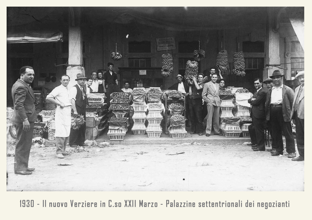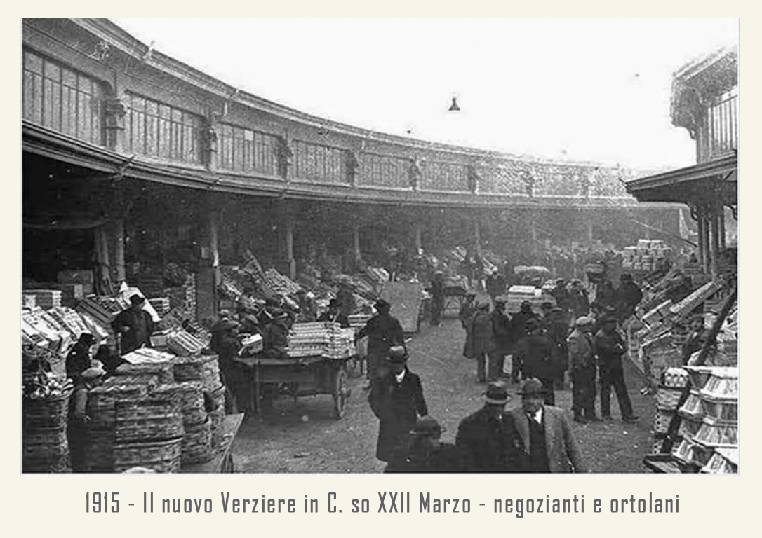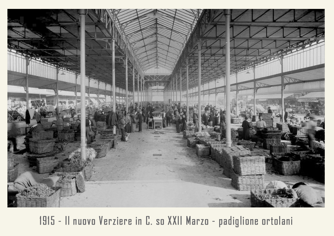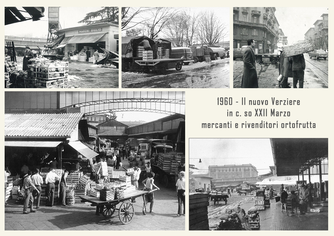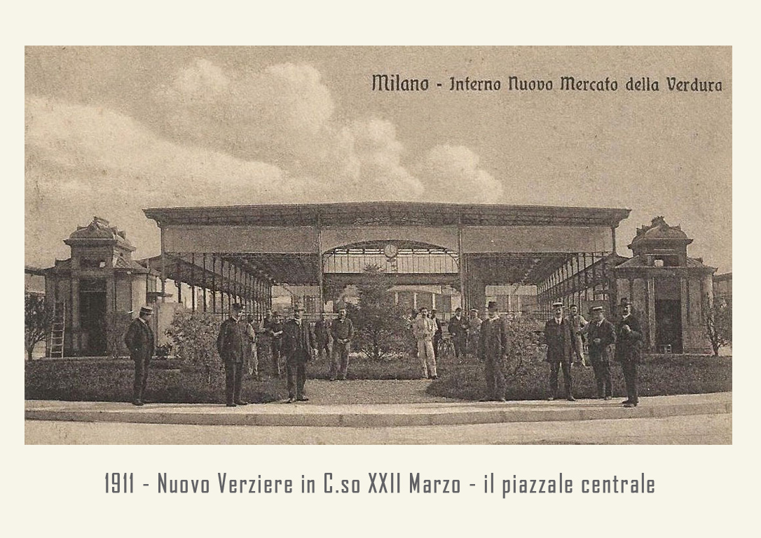 Il mercato è raccordato alle ferrovie dalla vicina stazione annonaria di Porta Vittoria. L’attività è animata da ortolani generici o specializzati, come quelli in sole patate, castagne o frutta che vengono da località allora molto rinomate: le ciliegie di Abbiategrasso, le verze e il sedano di Casalpusterlengo, i fichi della Brianza, i fagioli di Vigevano, ecc. Circa un migliaio di facchini animano le corsie del Verziere sono tutti in divisa: vestaglia a strisce verticali bianche e azzurre. Per tutti una vita decisamente faticosa, che richiede viaggi di notte, anche di 40 km in bicicletta, per arrivare al Nuovo Verziere e poi tutto il giorno a scaricare o caricare la merce, con una breve sosta a mezza mattina per rifocillarsi al bar centrale, la Palazzina Liberty appunto: trippa, cassoeula, nervetti con le cipolle e via di nuovo al lavoro.