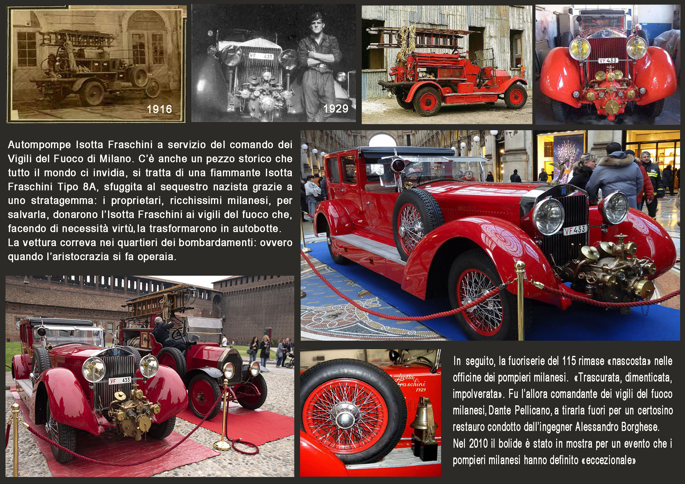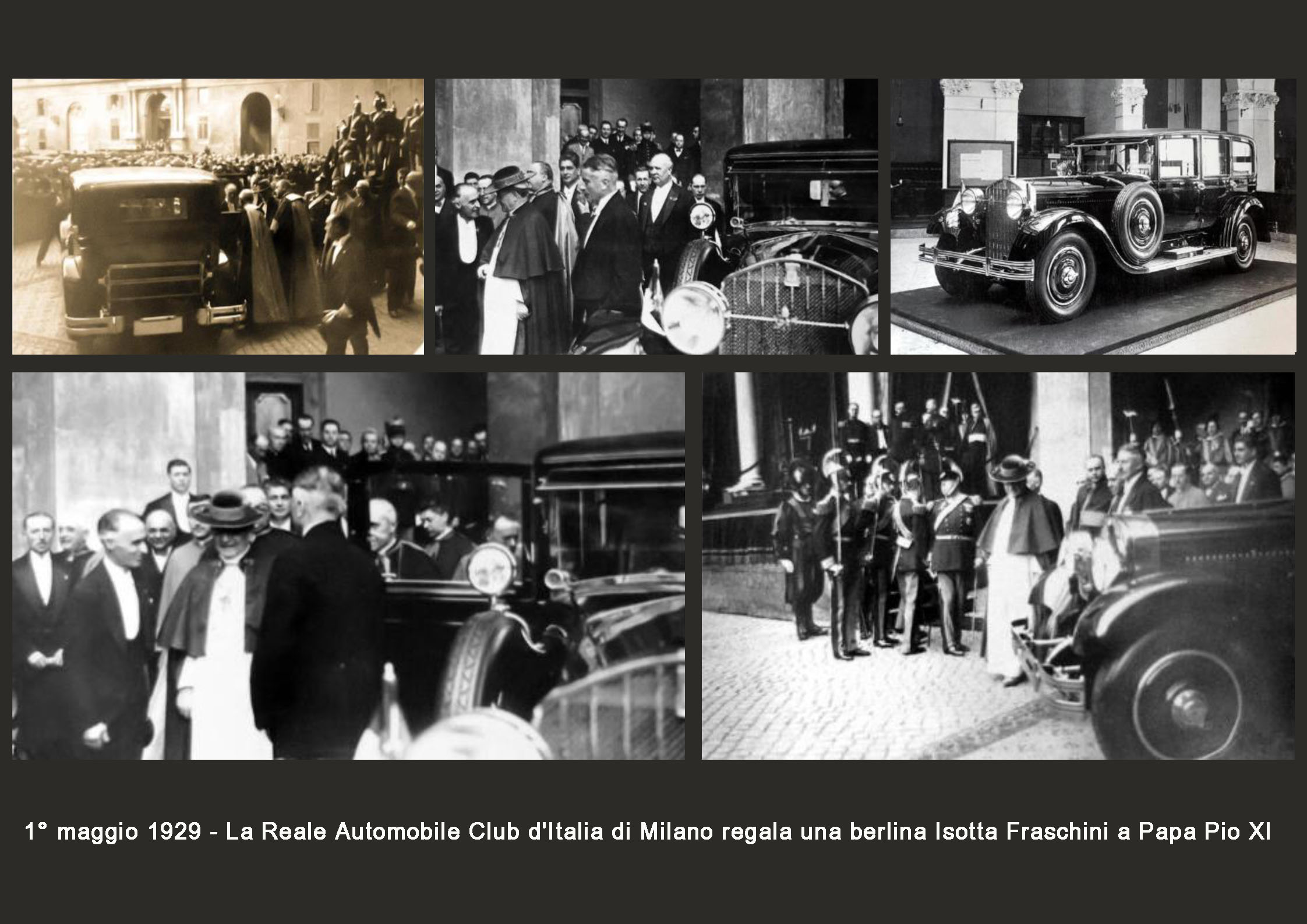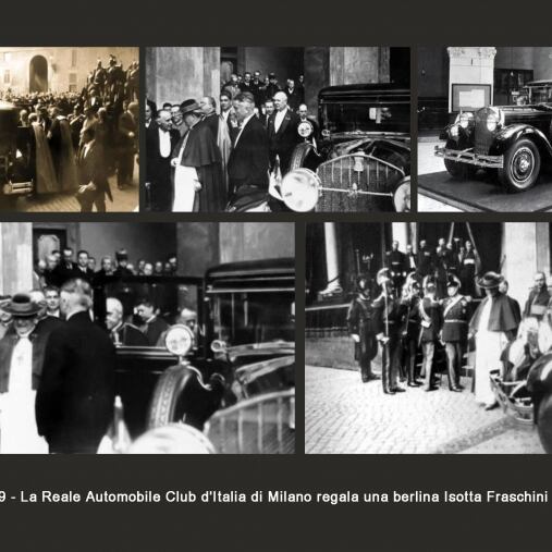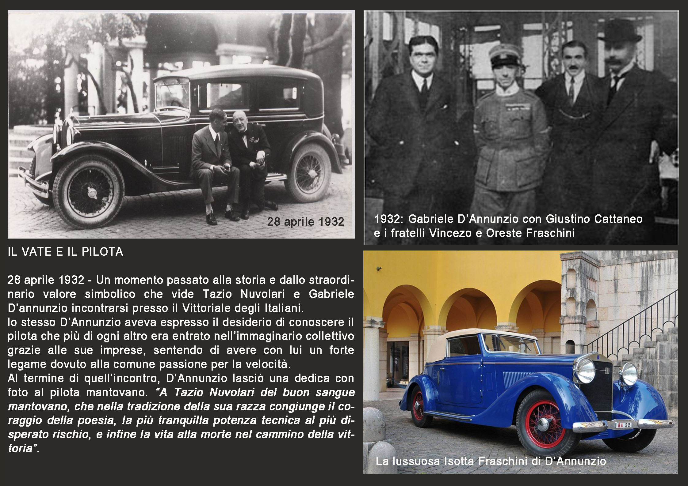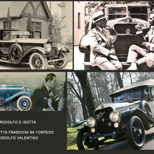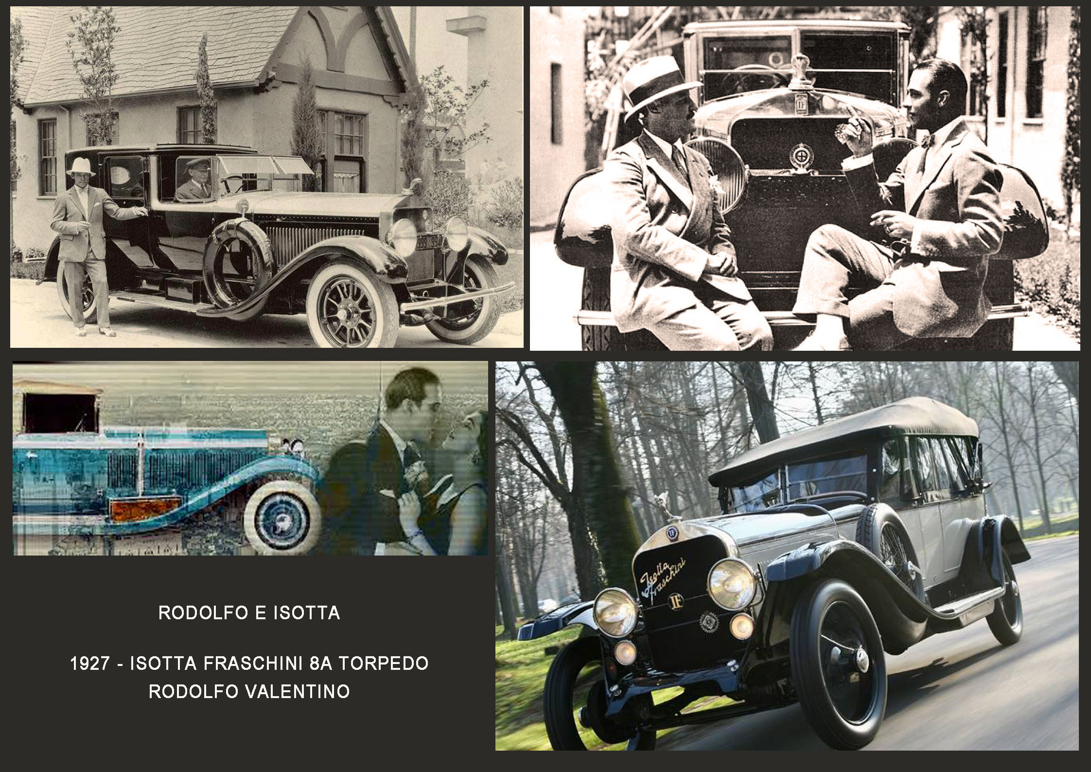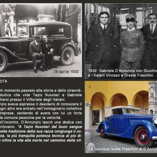 Possedere una Isotta Fraschini significa possedere una vera e propria opera d’arte: i principali rappresentanti delle case reali di quel tempo, zar, politici importanti e personaggi del mondo dello spettacolo si mettono letteralmente in fila per avere una Isotta Fraschini nel proprio garage. In Italia molte personalità dello spettacolo legano il loro nome a quello della Isotta Fraschini: il Duce Benito Mussolini il 7 settembre 1927 acquista una “8A” con telaio 1.408; l’ultimo Re d’Italia, Umberto di Savoia, ordina una coupé De Ville che rappresenta il modello più esclusivo e costoso; il celebre attore Rodolfo Valentino, invece, non accontentandosi di una, ordina ben due coupé De Ville. Nel maggio del 1929 la Reale Automobile Club d’Italia di Milano regala addirittura una Isotta Fraschini anche a Papa Pio XI. Tutte le personalità più in vista non si dimostrano immuni al fascino delle Isotta Fraschini, fascino cui non sa resistere neanche il poeta Gabriele d’Annunzio, grande appassionato di belle auto e della velocità. L’automobile è per il poeta pescarese uno dei mezzi di trasporto cui maggiormente è legato: l’auto è un’esaltazione del suo superuomo e della velocità oltre che della bellezza. Ne è testimone una lettera che il poeta scrive all’onorevole Prospero Gianferrari della Isotta Fraschini riguardo la sua vettura personale (soprannominata “Papessa” in virtù dei colori bianco e gialla) in cui dice: “Carissimo Prospero, la grande macchina viene a riverire e a gratulare il suo genial creatore. La Papessa è ormai ammirata in ogni parte e acclamata dalle folle in ogni via… Ma alla potenza del motore talvolta non risponde l’impeto pronto della velocità. Forse mi sarà utile che tu esamini ogni congegno perché tanta magnificenza è degna della massima perfezione”. La vettura in questione è una “Tipo 8B” con telaio 1410 che, nonostante la critica di d’Annunzio, è in grado di raggiungere la velocità di 150 km/h. L’amore di d’Annunzio per la velocità è di dominio pubblico, tanto che l’ultima fiamma del poeta, la Contessa Evelina Morasso Scapinelli scrive così in una lettera: ”Gabri, si sta allestendo per te una nuova macchina. La grossa e ben pasciuta Papessa si sente indegna di te, non va più. E’ necessario per te un nuovo, poderoso ordigno, lucente ed aereodinamico il quale sappia condurti a San Zeno in 25 minuti.”