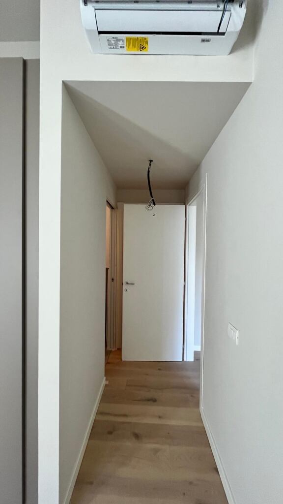Pavimento in parquet con plancia di rovere prima scelta 14 mm di spessore, impianto di riscaldamento autonomo a radiatori con boiler prima scelta, impianto di aria condizionata con pompa di calore e inverter, infissi nuovi bianchi in pvc e tapparelle elettriche, porte interne bianche satinate.