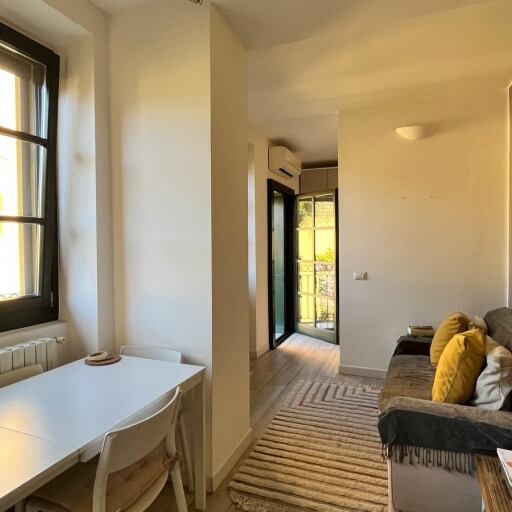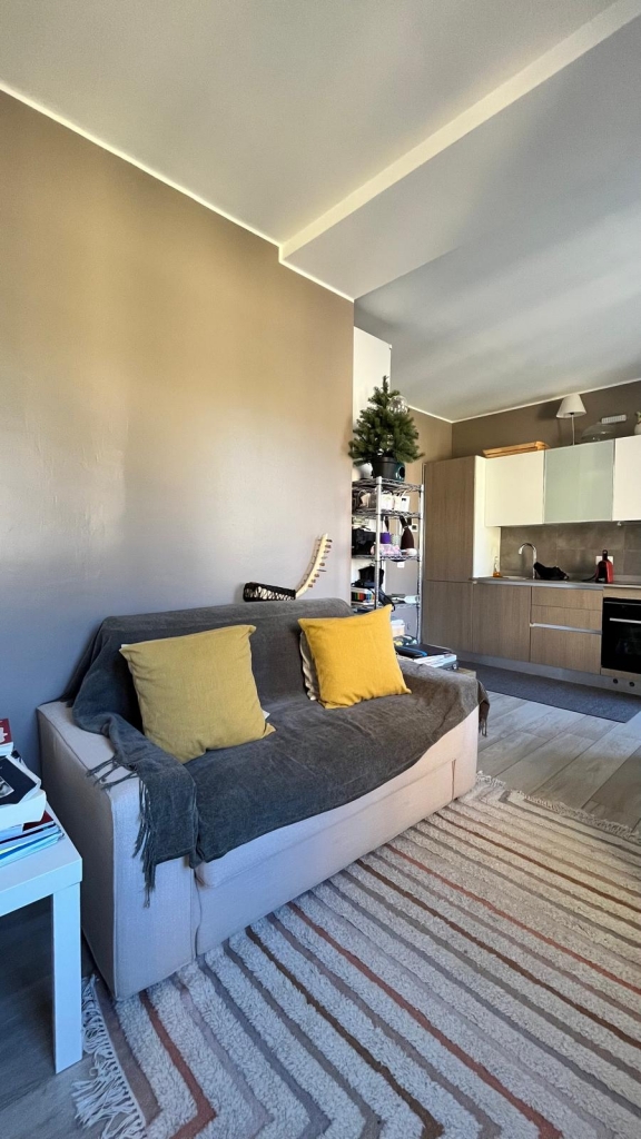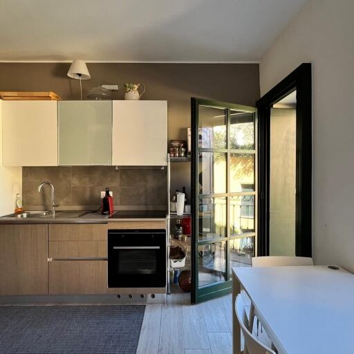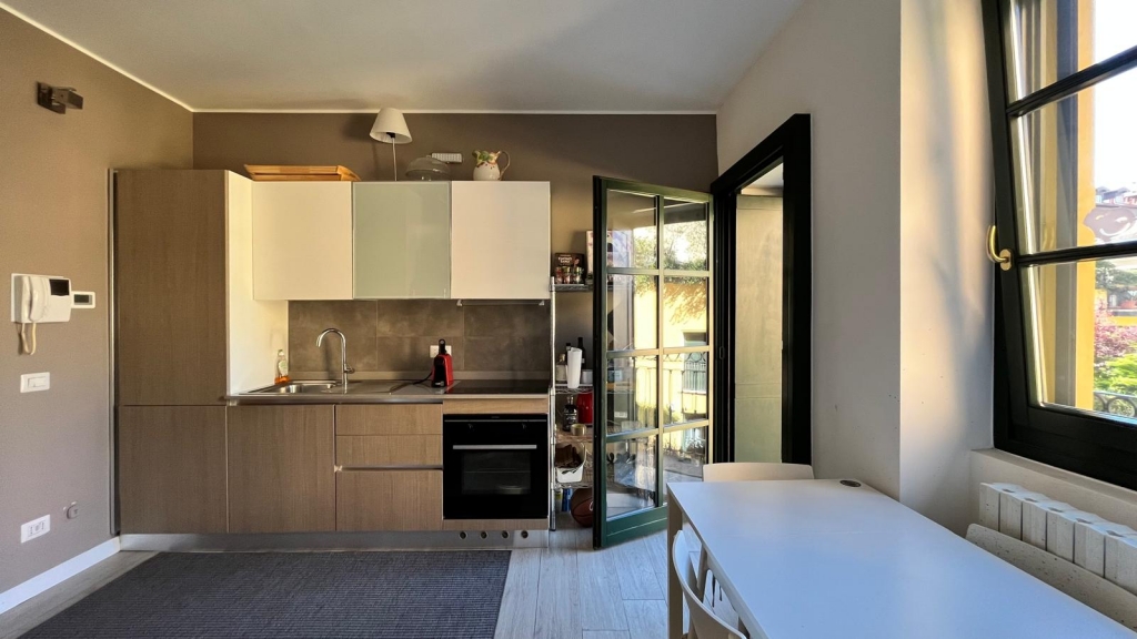 Zona giorno con cucina a vista e zona notte con letto matrimoniale, lavanderia/ripostiglio e bagno con doccia. Grandi finestre e due porte finestre che consentono l'uscita sulla balconata fruibile con vista sul verde.